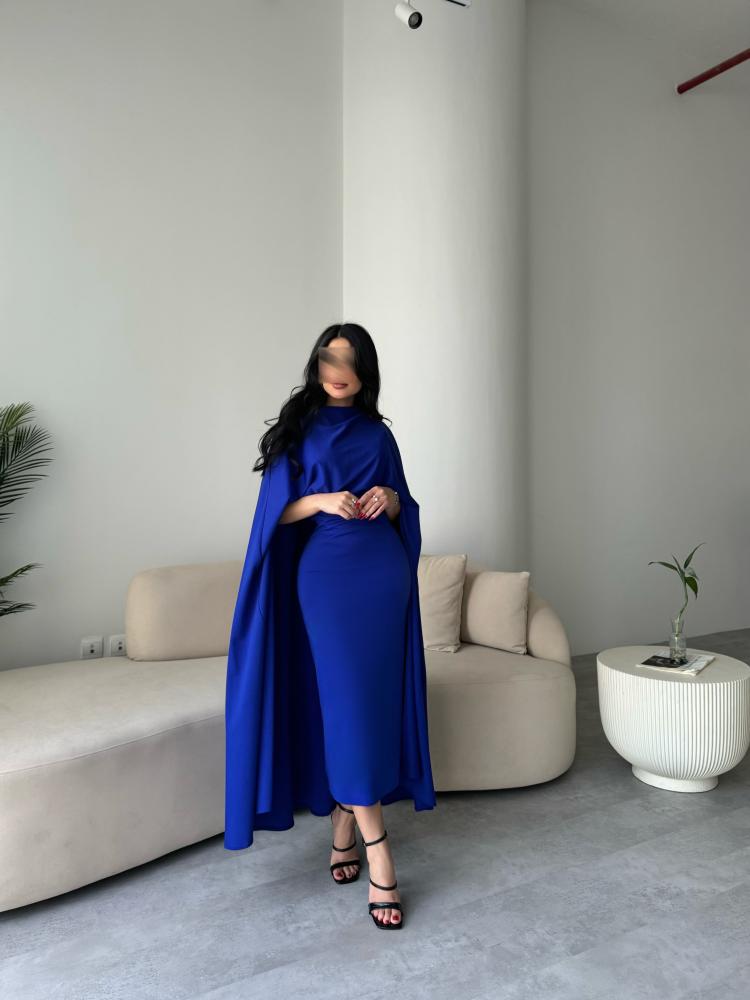 فستان أنيق برقبة دائرية واكمام طويلة شال الخصر بلون الفستان