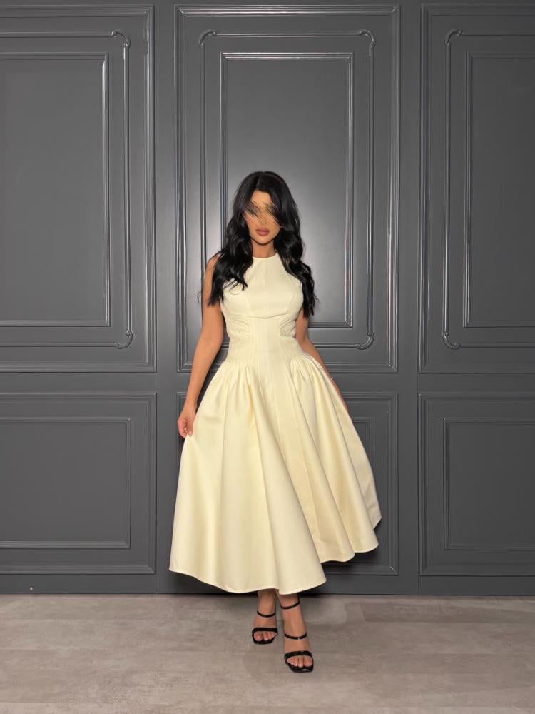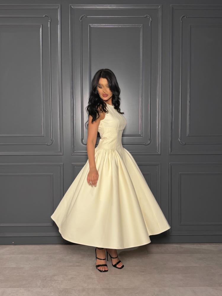 فستان أنيق يناسب مناسباتك الجميلة والسعيدة بقصة رقبة دائرية ولون نود اوف وايت مميز قماش كريب تفتة سلة