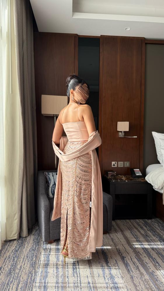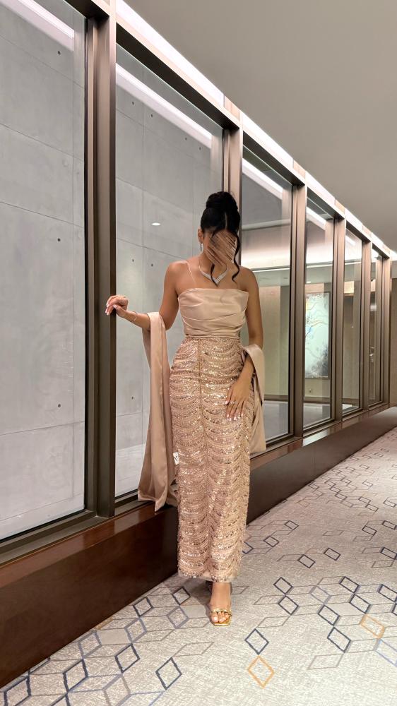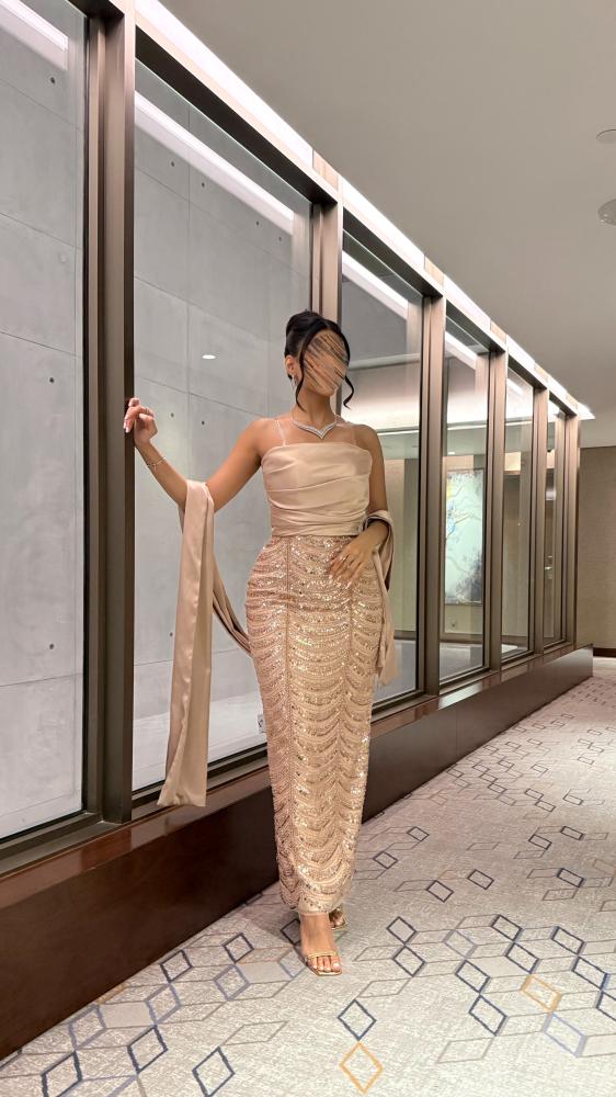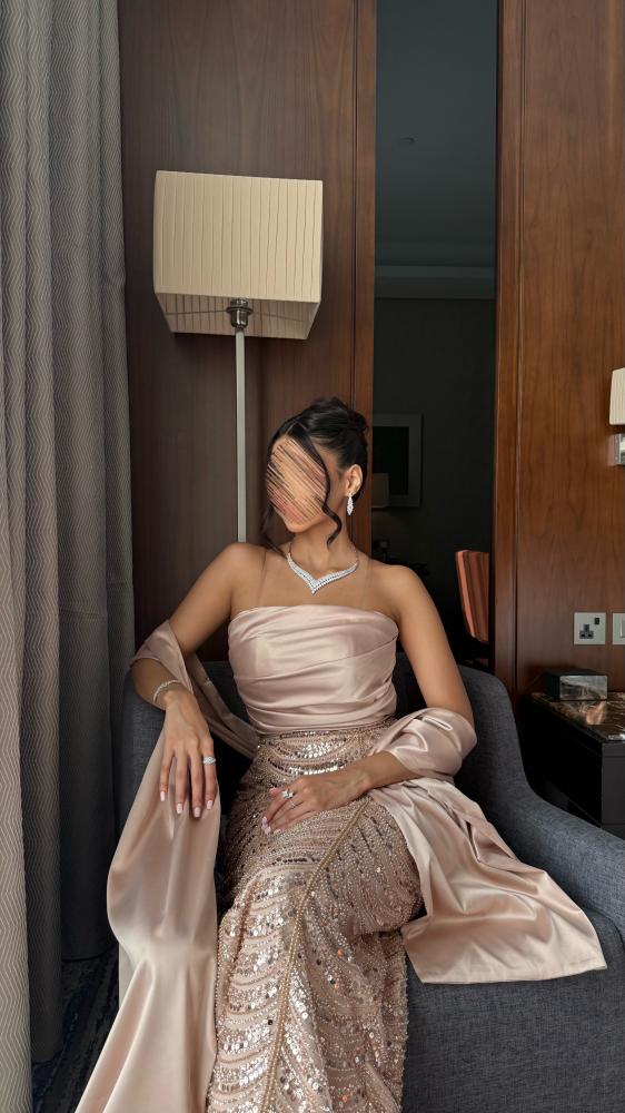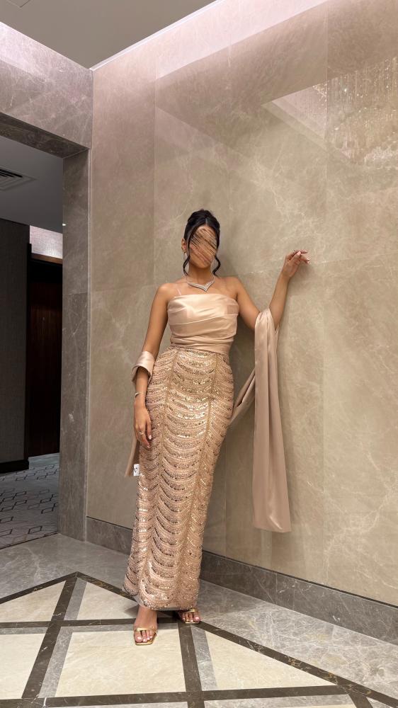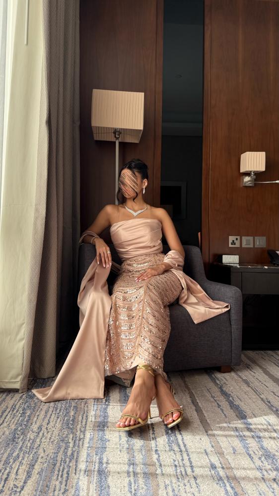 فستان سهرة بلون روز غولد بتصميم قطعة واحدة، مصنوع من قماش التفتة الفخم مع تطريز شك فاخر يضيف لمسة بريق وأناقة، ويأتي مع شال من نفس القماش لإطلالة راقية ومتكاملة. مثالي للمناسبات الفاخرة