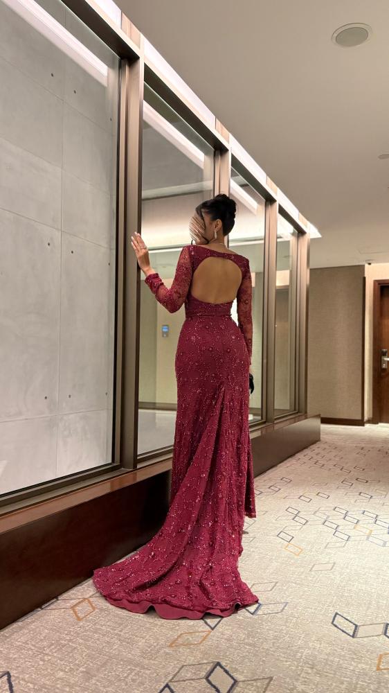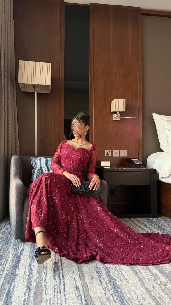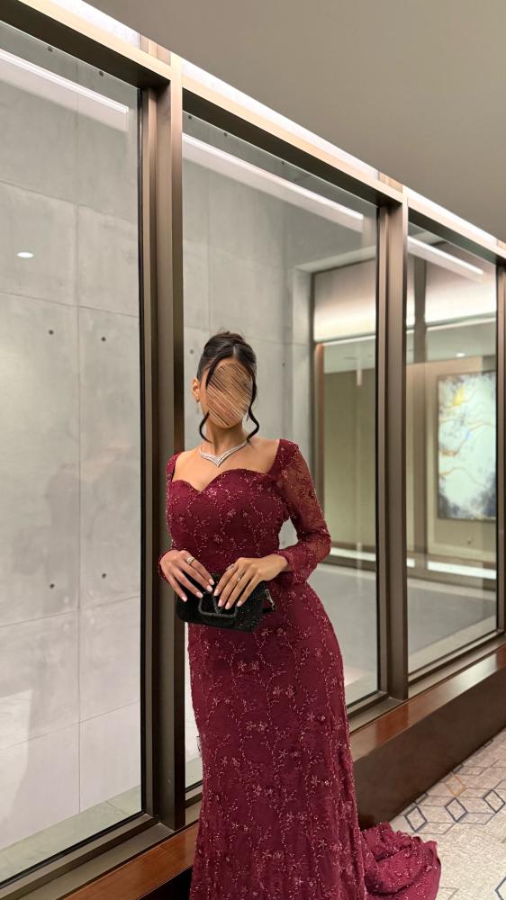 فستان سهرة فاخر بلون خمري، مصنوع من دانتيل فرنسي فخم مطرز بشك ورود ناعمة، بتصميم ضيق يبرز القوام مع ذيل طويل وفتحة خلفية أنيقة. مثالي للمناسبات الراقية